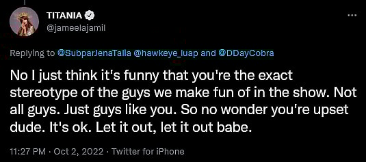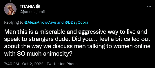 “Man this is a miserable and aggressive way to live and speak to strangers dude,” replied Jamil. “Did you… feel a bit called out about the way we discuss men talking to women online with SO much animosity?”