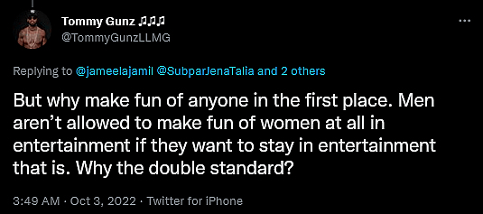 Puzzled by her seeming pride in the series mocking a particular ‘type of guy’, @TommyGunzLLMG politely asked, “But why make fun of anyone in the first place.”