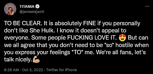 Eventually, following roughly two-days of interaction with She-Hulk‘s fans and critics, Jamil asserted on October 3rd, “TO BE CLEAR. It is absolutely FINE if you personally don’t like She Hulk. I know it doesn’t appeal to everyone. [But] Some people F–KING LOVE IT.”