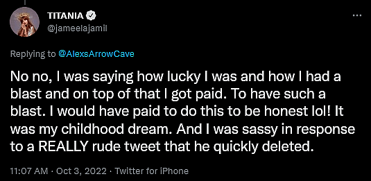 “No no, I was saying how lucky I was and how I had a blast and on top of that I got paid,” clarified Jamil. “To have such a blast. I would have paid to do this to be honest lol! It was my childhood dream. And I was sassy in response to a REALLY rude tweet that he quickly deleted.”