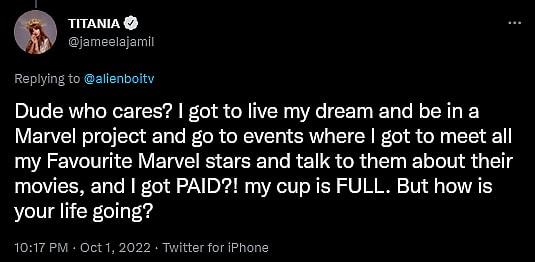 “Dude who cares?” fired back Jamil. “I got to live my dream and be in a Marvel project and go to events where I got to meet all my Favourite Marvel stars and talk to them about their movies, and I got PAID?! my cup is FULL.”