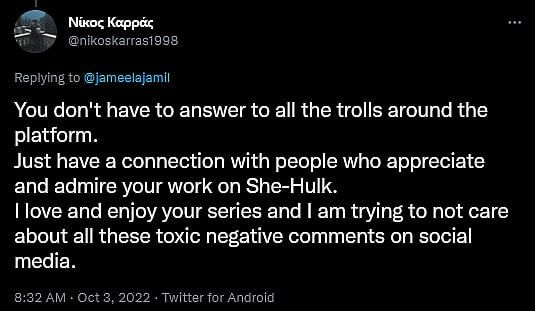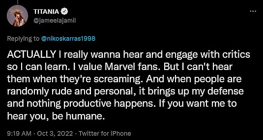Met with a recommendation from @nikoskarras1998 that she did not “have to answer all the trolls around the platform” and should instead “just have a connection with people who appreciate and admire your work on She-Hulk, Jamil declared, “ACTUALLY I really wanna hear and engage with critics so I can learn.”