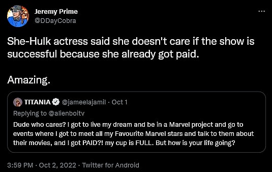 Jamil’s snap finding its way across his desk, Geeks + Gamers founder Jeremy Griggs soon joined the conversation, observing “She-Hulk actress said she doesn’t care if the show is successful because she already got paid. Amazing.”