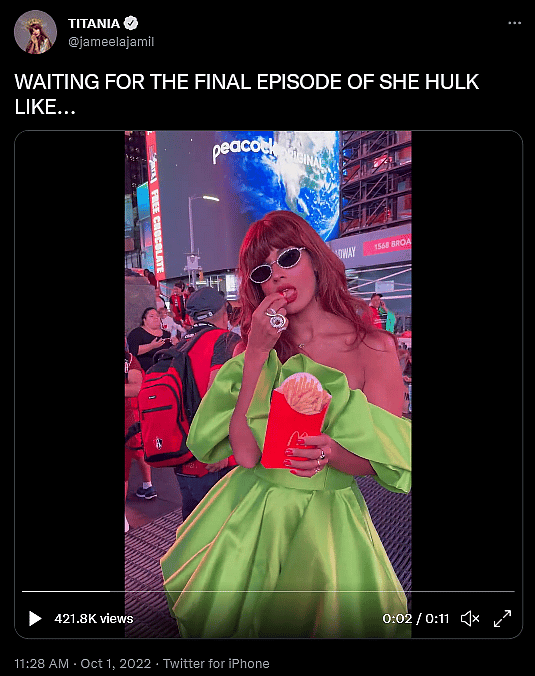 Jamil’s latest foray into the world of She-Hulk criticism began on October 1st as a result of the actress sharing a playful video of herself eating McDonalds french fries in New York City’s Time Square alongside the caption, “WAITING FOR THE FINAL EPISODE OF SHE HULK LIKE…”