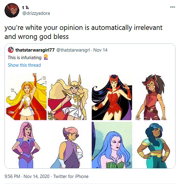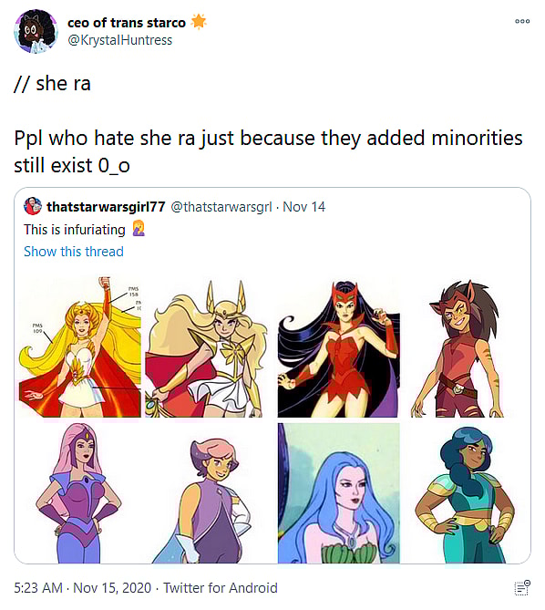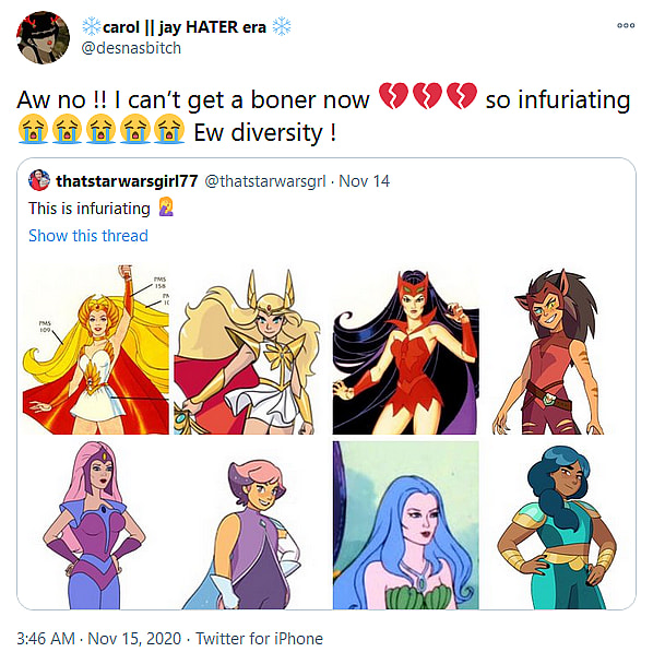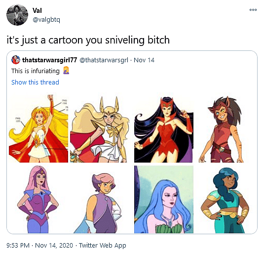 In response to this three-word tweet, She-Ra fans descended upon TSWG’s account, bombarding her with insults, insinuating bigoted motives for her posting of the tweet, and asserting their preference for the simplified designs of Noelle Stevenson’s reboot.