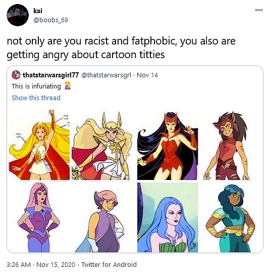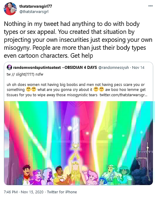 “You created that situation by projecting your own insecurities just exposing your own misogyny,” observed TSWG. “People are more than just their body types even cartoon characters. Get help”.