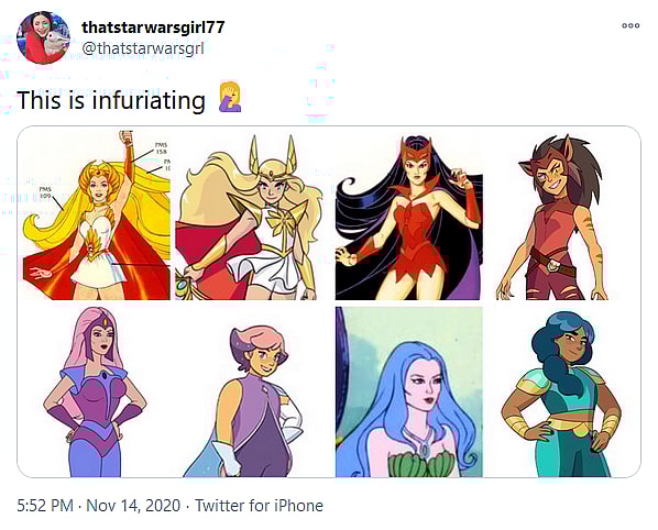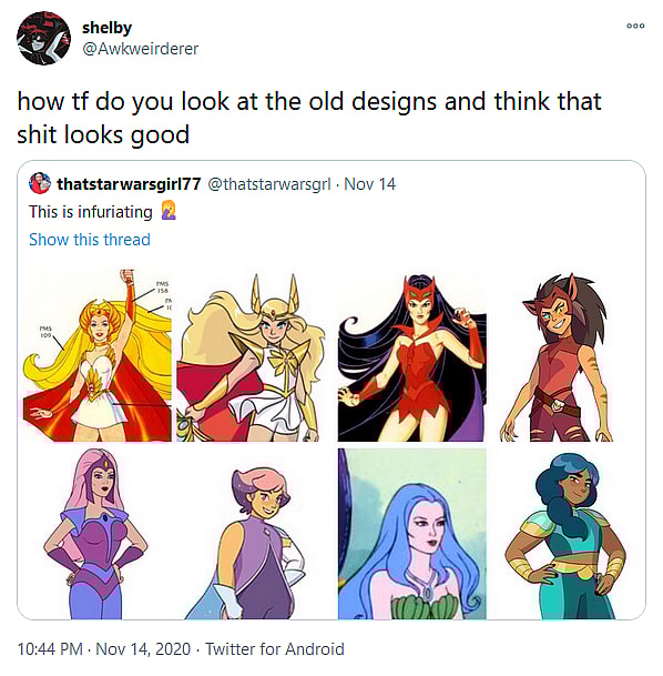 On November 14th, TSWG posted a series of tweets comparing the Netflix redesigns of She-Ra and other members of the Great Rebellion with their original designs, as seen in the original 1985 She-Ra: Princess of Power animated series.