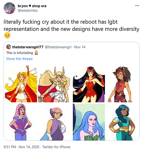 “Literally f—ing cry about it,” said @wlwbimbo, who then insinuated that TSWG’s criticism was not based on the aesthetics of the reboot, but rather on how it “has lgbt representation and the new designs have more diversity”.