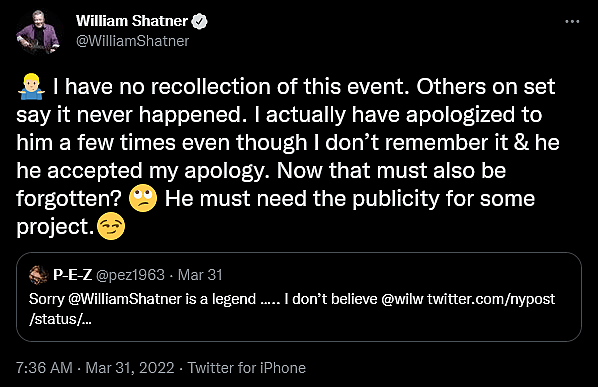 Responding to Wheaton’s story on Twitter, the Star Trek icon wrote, “I have no recollection of this event.”