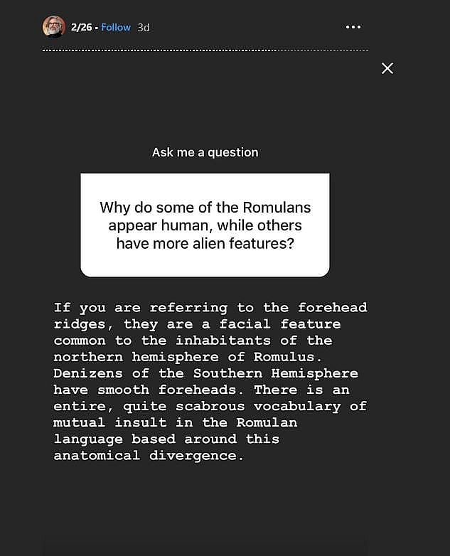 Chabon responded, “If you are referring to the forehead ridges, they are a facial feature common to the inhabitants of the northern hemisphere of Romulus.”