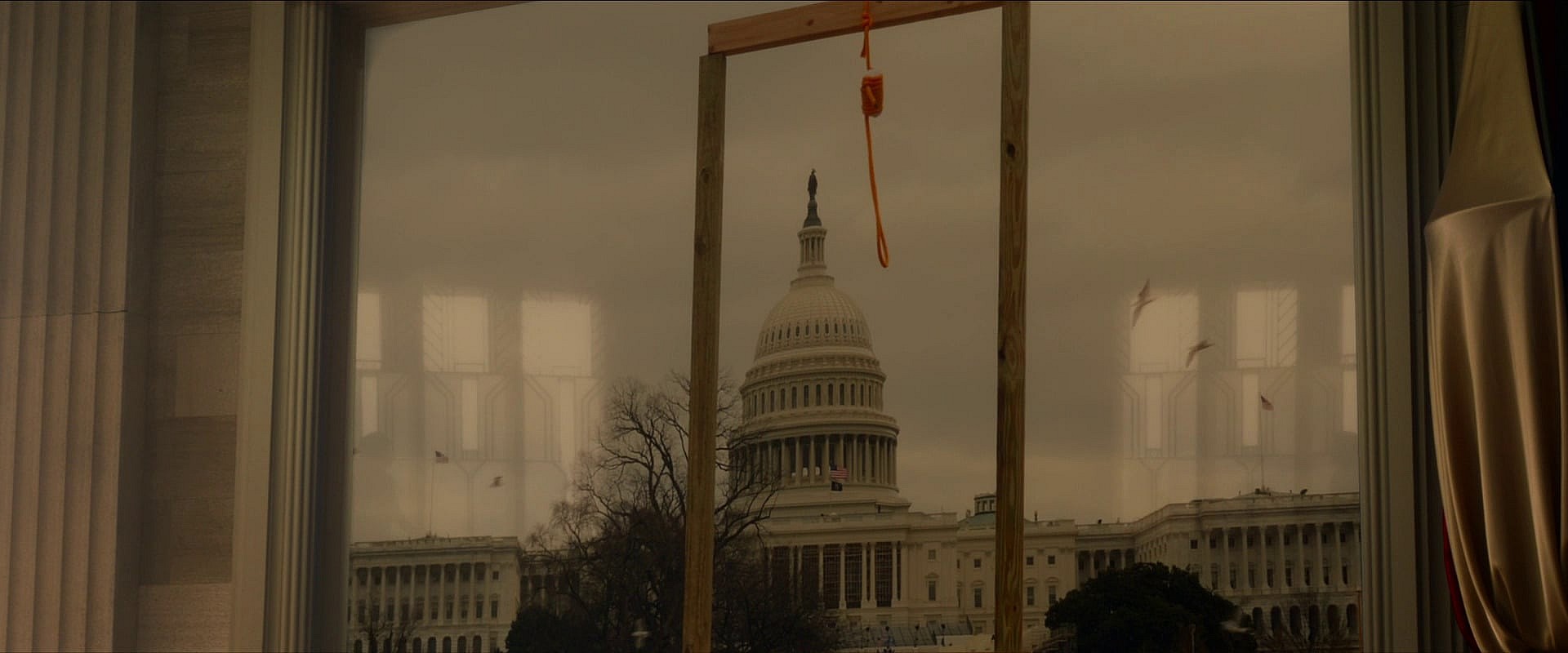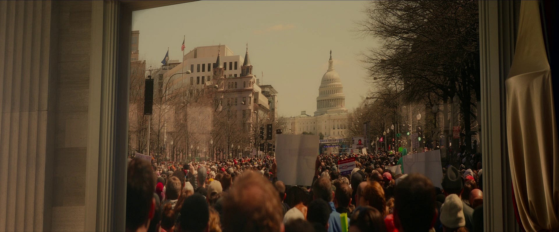 Playing actual news footage from not just the aforementioned riots, but the peaceful protests earlier in the day, Pike asserts, “Our conflict also started with a fight for freedoms. We called it the Second Civil War.”