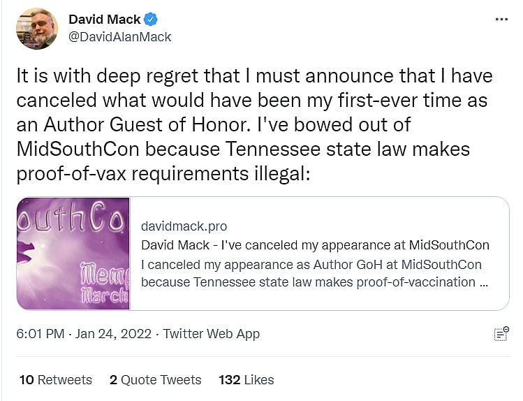 In his blog post, Mack provided more details stating, “It is with deep regret that I have canceled my appearance as the Author Guest of Honor for this year’s MidSouthCon, because of the impossibility of verifying the vaccination/negative test status of attendees, staff, guests, and volunteers as a condition of attendance.”