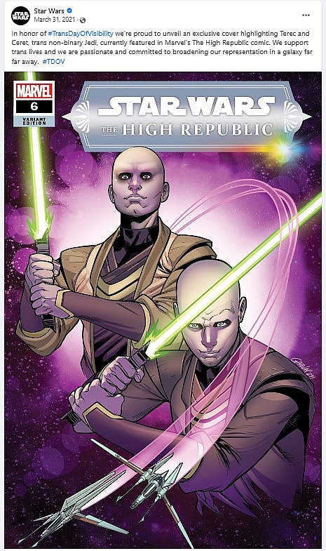 They posted to Facebook, “In honor of #TransDayOfVisibility we’re proud to unveil an exclusive cover highlighting Terec and Ceret, trans non-binary Jedi, currently featured in Marvel’s The High Republic comic. We support trans lives and we are passionate and committed to broadening our representation in a galaxy far far away. #TDOV”