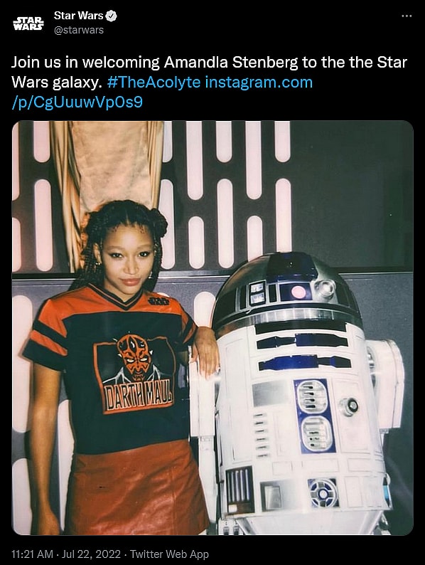 The official Star Wars account announced back in July 2022, “Join us in welcoming Amandla Stenberg to the Star Wars galaxy. #TheAcolyte.”