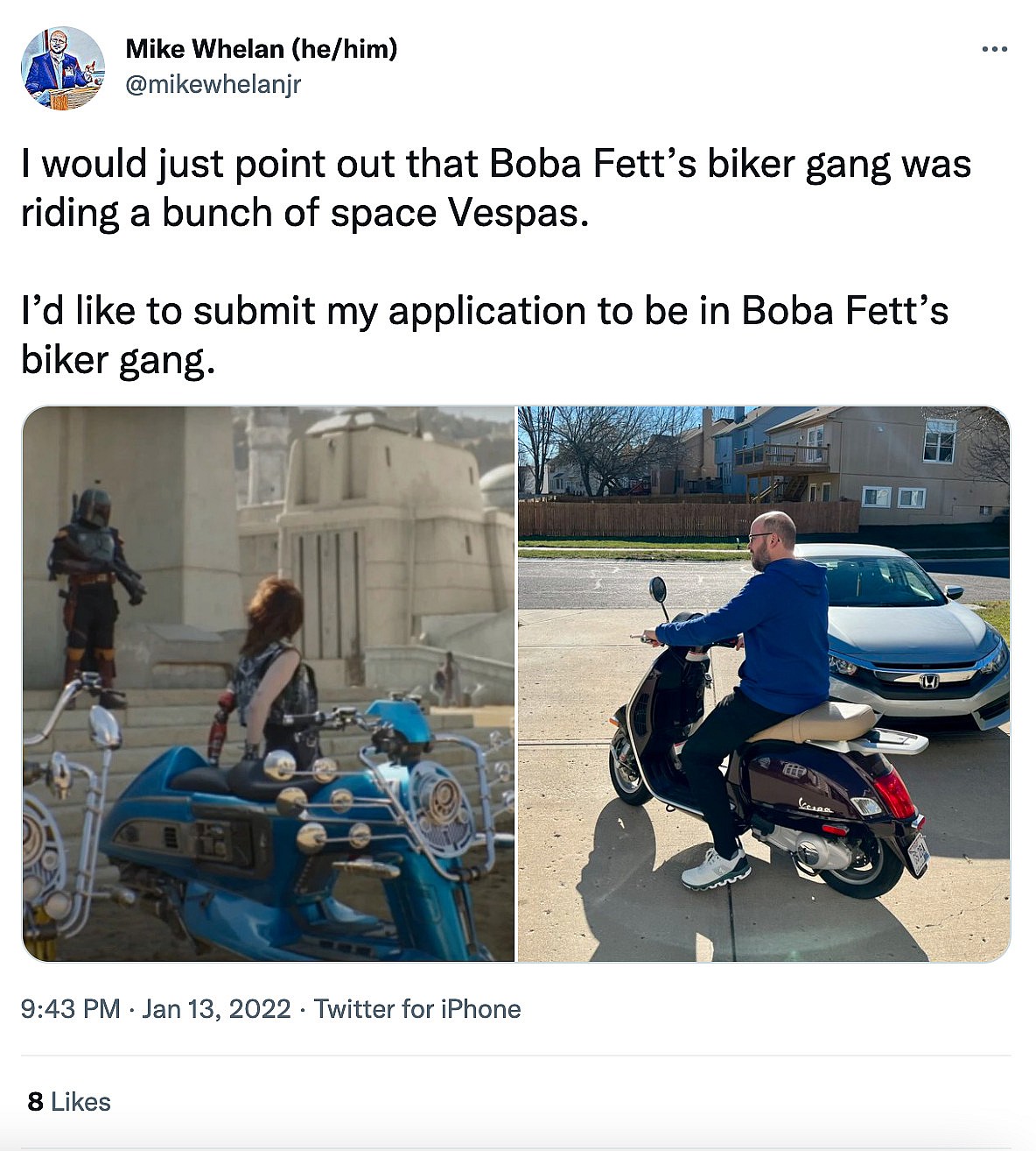 “I would just point out that Boba Fett’s biker gang was riding a bunch of space Vespas,” tweeted Mike Whelan.