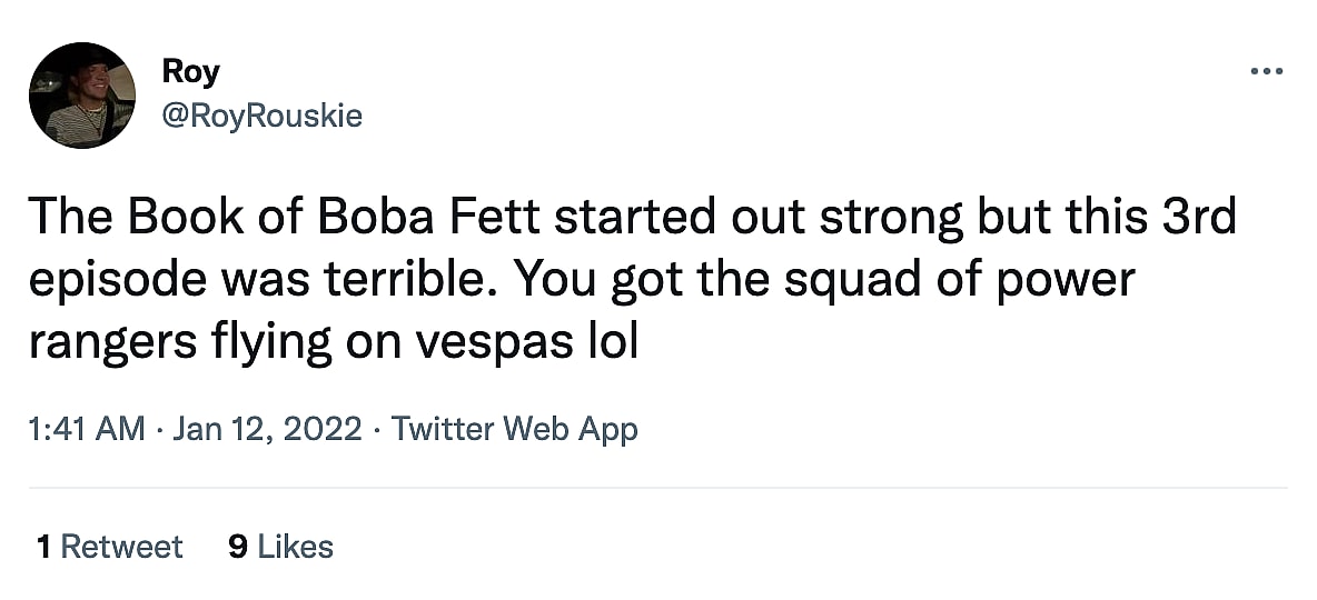 “The Book of Boba Fett started out strong but this 3rd episode was terrible. You got the squad of power rangers flying on vespas lol,” one Twitter user wrote.