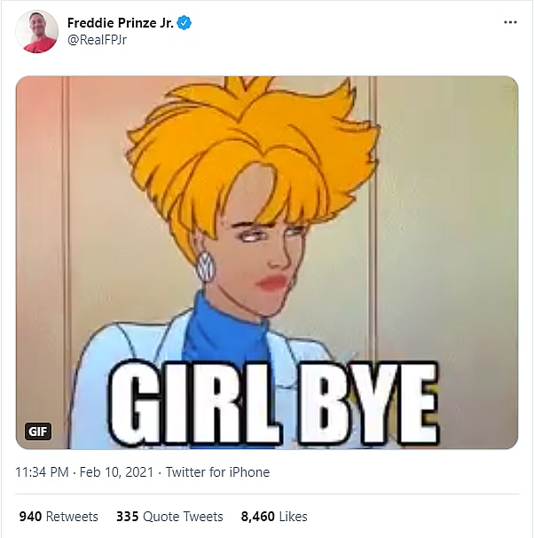 Freddie Prinze Jr., who has repeatedly attacked Star Wars fans in the past, posted a gif of a woman slapping another woman that reads, “Girl Bye.”