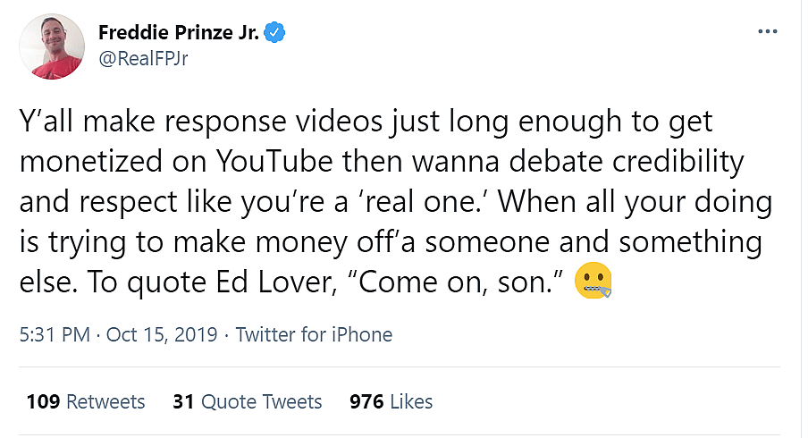 He wrote on Twitter, “Y’all make response videos just long enough to get monetized on YouTube then wanna debate credibility and respect like you’re a ‘real one.’ When all your doing is trying to make money off’a someone and something else. To quote Ed Lover, ‘Come on, son.'”