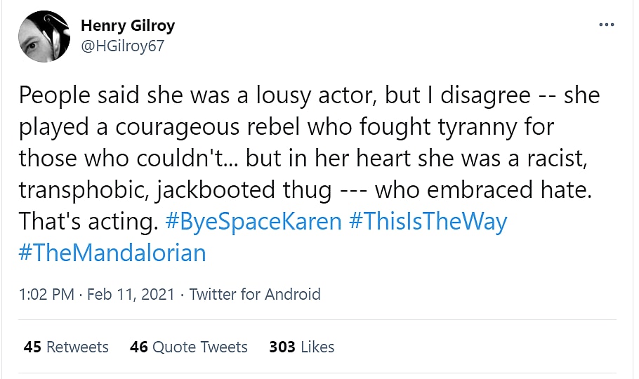 Gilroy, who is currently working on Netflix’s Magic: The Gathering TV series, concluded with the following hashtags, “#ByeSpaceKaren #ThisIsTheWay #TheMandalorian.”