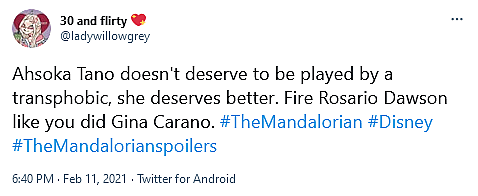 Stan twitter’s arguement against Dawson’s was best summed up by @ladywillowgrey, who declared that “Ahsoka Tano doesn’t deserve to be played by a transphobic, she deserves better”, before demanding that Disney “Fire Rosario Dawson like you did Gina Carano” .