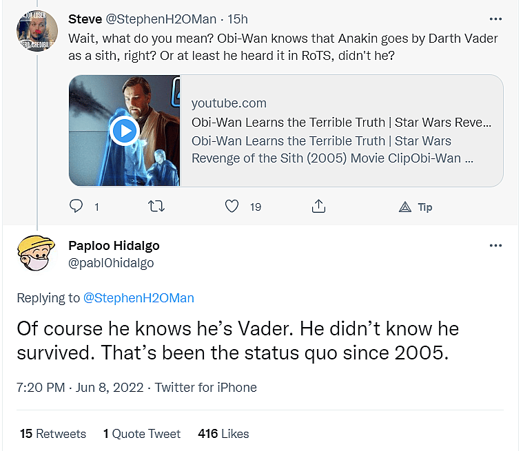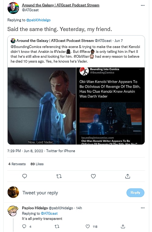 In response to Twitter user StephenH2OMan who pointed to the scene in Revenge of the Sith where Kenobi sees the security footage, Hidalgo wrote, “Of course he knows he’s Vader. He didn’t know he survived. That’s been the status quo since 2005.”