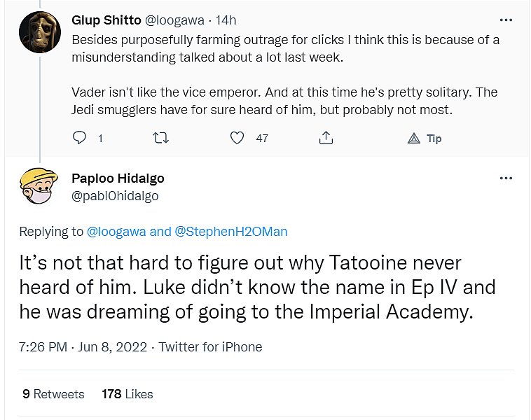 Hidalgo then attempted to justify it by claiming no one on Tatooine had heard of Darth Vader, “It’s not that hard to figure out why Tatooine never heard of him. Luke didn’t know the name in Ep IV and he was dreaming of going to the Imperial Academy.”