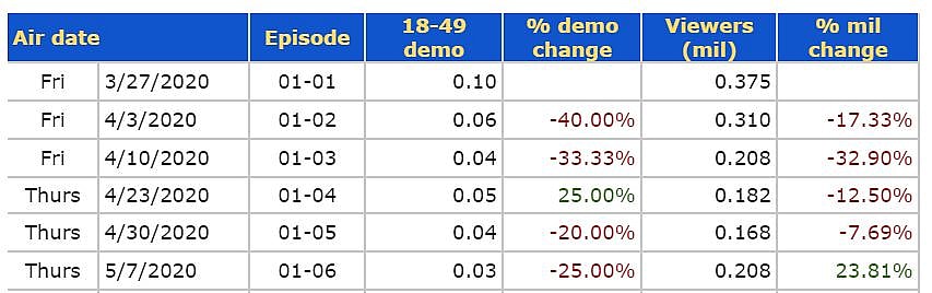 The sixth episode of the first season that aired on Thursday, May 7th posted a .03 rating in the 18-49 demographic and only saw viewership at 208,000 people according to TV Series Finale.