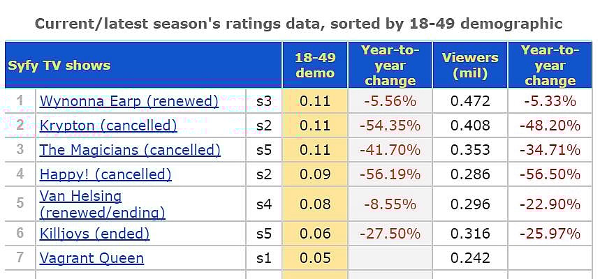 The show falls behind Wynona Earp Season 3, Krypton’s Season 2, The Magicians Season 5, Happy!’s Season 2, Van Helsing’s Season 4, and Killjoys Season 5.