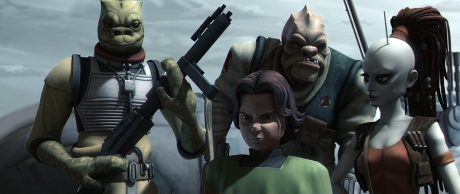 The team consists of Bossk, Latts Razzi, Dengar, and C-21 Highsinger. The bounty hunter Oked had previously been part of the team, but he’s killed by the Sith assassin Asajj Ventress in a cantina on Tatooine.