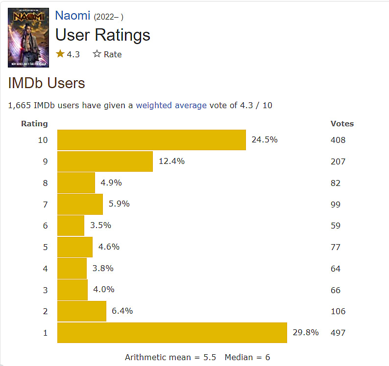 The show has an absolutely abysmal user score on IMDb. It currently has a weighted average of 4.3 out of 10. The arithmetic mean is 5.5 and the median is 6.