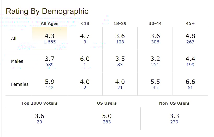 Looking at the demographics it performing marginally hire among women compared to men albeit the female sample size is significantly smaller than males. Females on average give the show a 5.9 while males on average give it a 3.7.