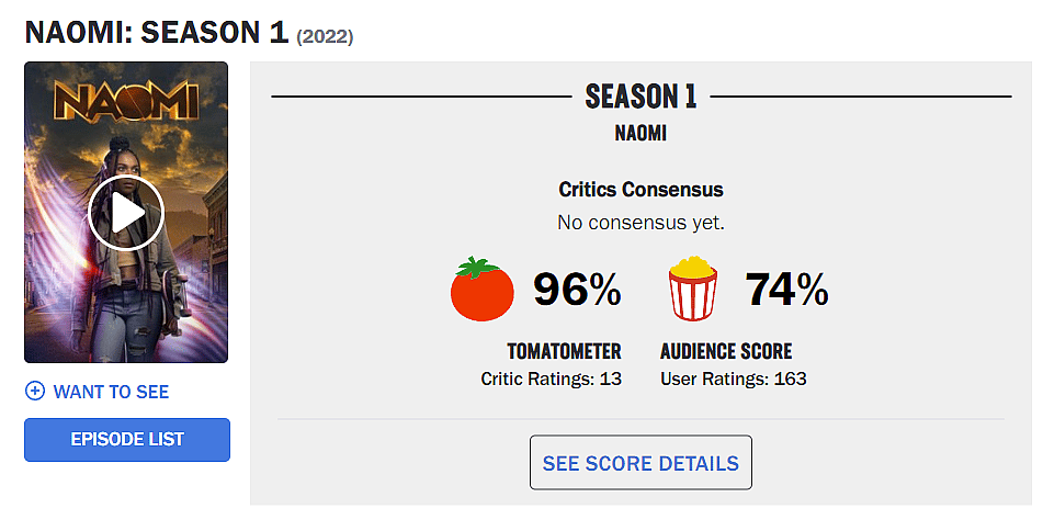 Not only did Naomi see its viewership tank, but its ratings also fell by almost 10%. It dropped to .10 from .11 in the 18-49 demographic. The first episode had a .14 rating.