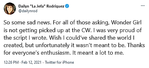 The news came from Queen of the South show runner Dailyn Rodriguez, who had been tapped to write and run the now-dead Wonder Girl series. “So some sad news. For all of those asking, Wonder Girl is not getting picked up at the CW,” she wrote on Twitter.