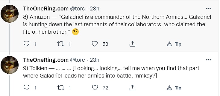 In a subsequent tweet, they noted, “9) Tolkien — … … … [Looking… looking… tell me when you find that part where Galadriel leads her armies into battle, mmkay?]”