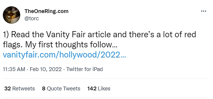 TheOneRing.com expressed their concern for the show noting the Vanity Fair article raised multiple “red flags” for the show in a thread on Twitter.