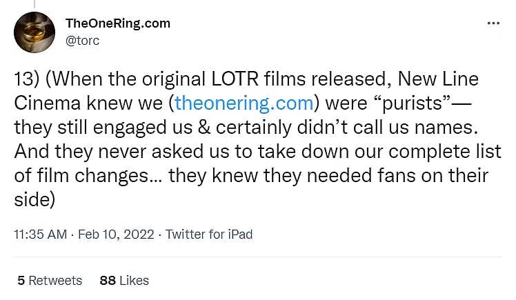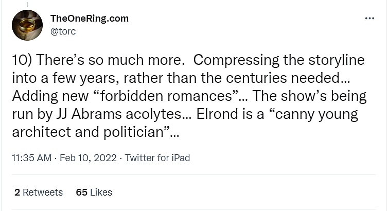 They elaborated on this point writing, “12) I believe Tolkien knew what he was doing when he wrote his stories. And for Amazon to come in and inject their own modern sensibilities into it while throwing ad hominem attacks at Tolkien fans with deep vested interest in his work (like me) won’t end well for them.”