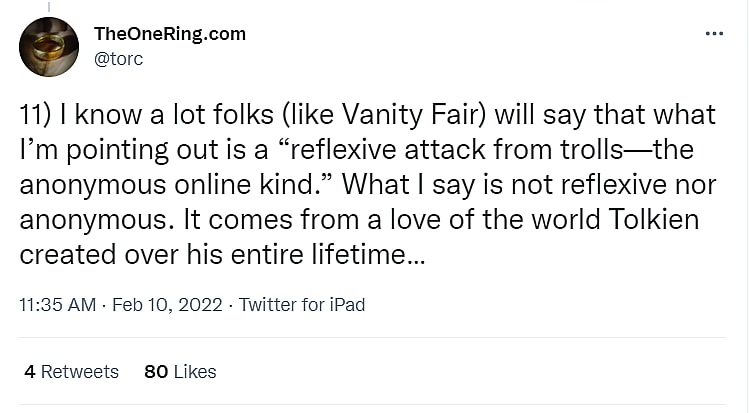 TheOneRing.com tweeted in response to this, “11) I know a lot folks (like Vanity Fair) will say that what I’m pointing out is a ‘reflexive attack from trolls—the anonymous online kind.’ What I say is not reflexive nor anonymous. It comes from a love of the world Tolkien created over his entire lifetime…”