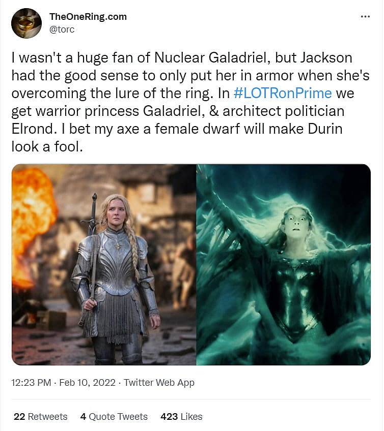 In another tweet, the outlet lampooned Galadriel’s armored design as well as the characterization of Elrond and the newly introduced dwarf princess writing, “I wasn’t a huge fan of Nuclear Galadriel, but Jackson had the good sense to only put her in armor when she’s overcoming the lure of the ring. In #LOTRonPrime we get warrior princess Galadriel, & architect politician Elrond. I bet my axe a female dwarf will make Durin look a fool.”