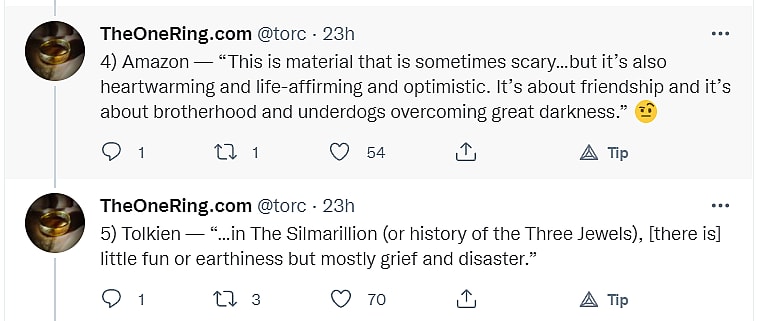 They wrapped up the thread tweeting, “14) Amazon can make as many claims that what they’ve created really is Tolkien’s world. 1/2 of Tolkien fandom won’t buy it, though. My expectations weren’t high for this show to begin with. They just dropped much much lower.”