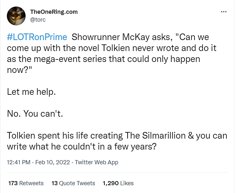 They added, “Let me help. No. You can’t. Tolkien spent his life creating The Silmarillion & you can write what he couldn’t in a few years?”