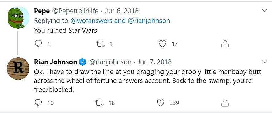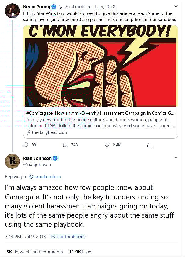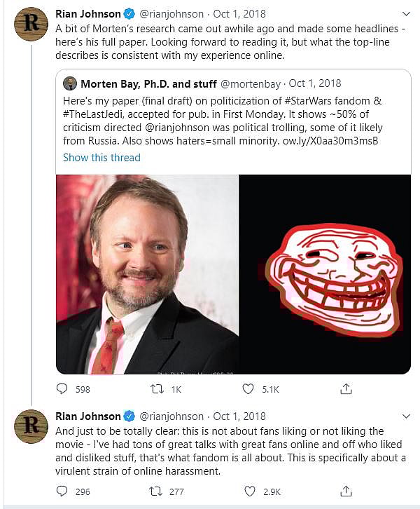 Johnson would go so far as to describe fans who disliked The Last Jedi as participating in “violent harassment campaigns.”