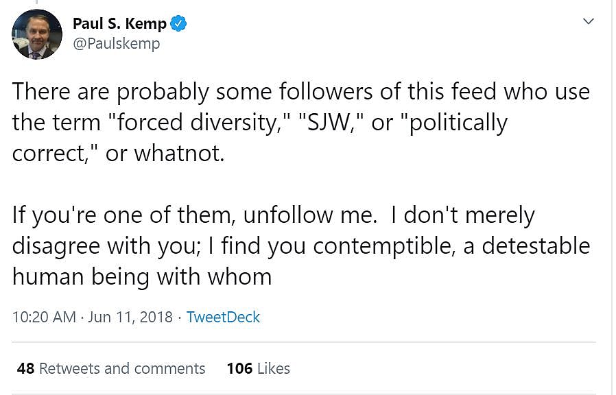 Kemp continued, “There are probably some followers of this feed who use the term “forced diversity,” “SJW,” or “politically correct,” or whatnot. If you’re one of them, unfollow me. I don’t merely disagree with you.”
