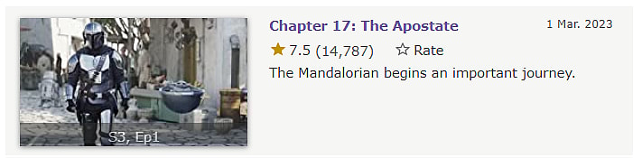 The Season 3 premiere “Chapter 17: The Apostate” was previously tied with “Chapter 5: The Gunslinger” for the worst rated episode with a 7.5.