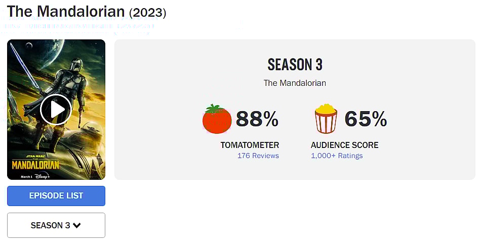 It’s not just users on IMDb giving The Mandalorian its worst reviews ever. On Rotten Tomatoes, the audience score slipped from Season 1 posting an Audience Score of 92% and Season 2 receiving an Audience Score of 91%.