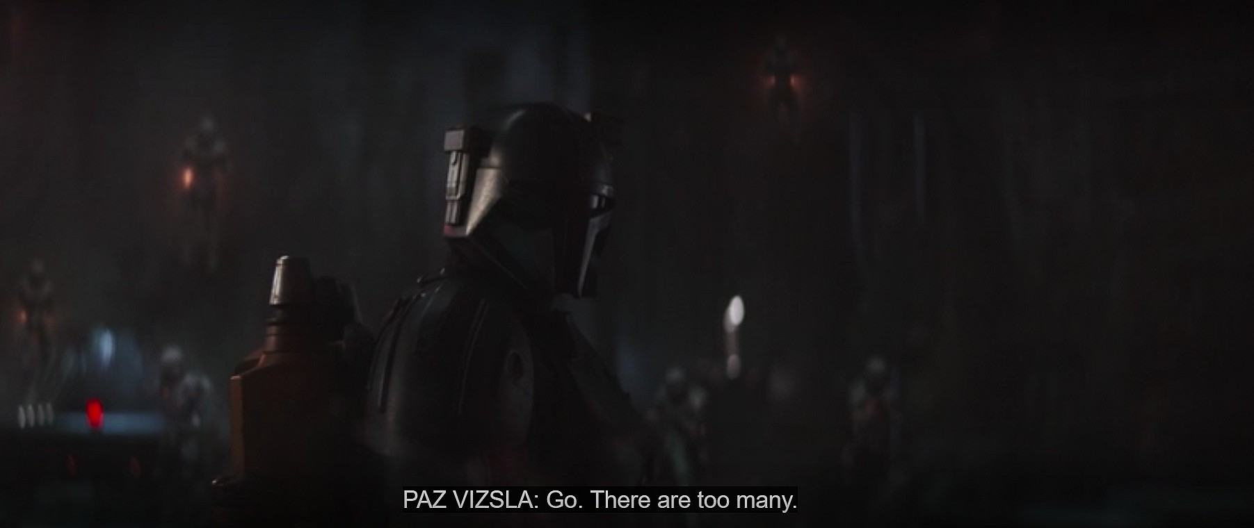 And then when she does cut a whole to offer the Mandalorians an option to escape, Paz Viszla who was mowing down Gideon’s forces with his minigun, chooses not to escape telling Bo-Katan, “Go. There are too many. This is the way”