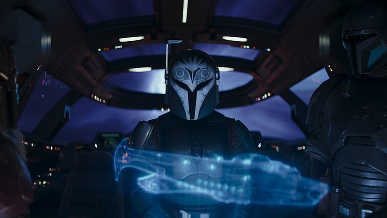 (L-R): The Armorer (Emily Swallow), Bo-Katan Kryze (Katee Sackhoff) and Paz Vizsla (Tait Fletcher) in Lucasfilm's THE MANDALORIAN, season three, exclusively on Disney+. ©2023 Lucasfilm Ltd. & TM. All Rights Reserved.