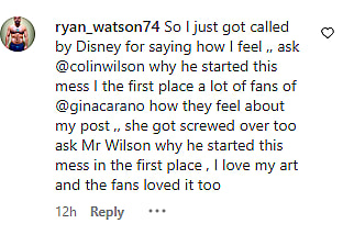 “[Ask] a lot of fans of @ginacarano how they feel about my post,” he suggested. “She got screwed over too. Ask Mr Wilson why he started this mess in the first place. I love my art and the fans loved it too.”