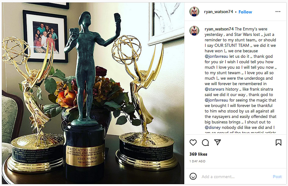 Taking to the social media platform following The Book of Boba Fett‘s securing one Emmy win for “Outstanding Special Visual Effects In A Season Or A Movie” but losing out on the awards for their other nominated categories of “Outstanding Sound Editing For A Comedy Or Drama Series”, “Outstanding Fantasy/Sci-Fi Costumes”, and “Outstanding Stunt Coordination For A Drama Series, Limited Or Anthology Series Or Movie”, Watson shared an image of The Mandalorian‘s past Emmy and Screen Actor Guild Awards and declared, “The Emmy’s were yesterday , and Star Wars lost, [but] just a reminder to my stunt team, or should I say OUR STUNT TEAM, we did it we have won!”