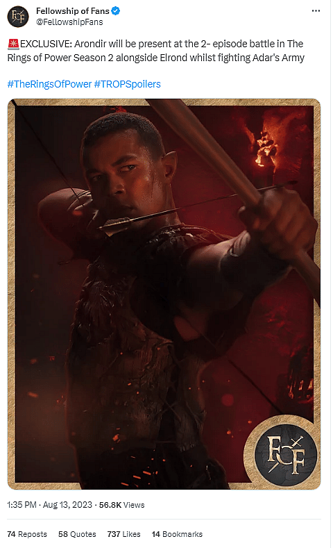 The scooper posited, “Arondir will be present at the 2- episode battle in The Rings of Power Season 2 alongside Elrond whilst fighting Adarâs Army