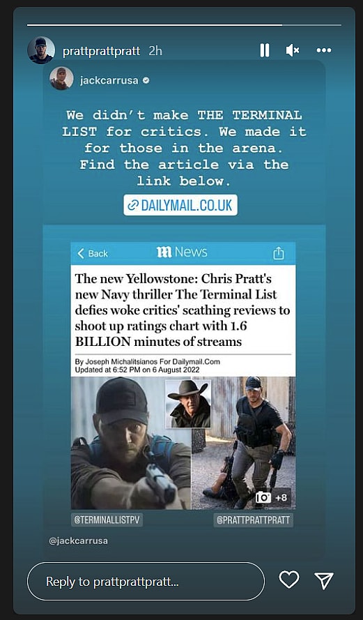 The two men spoke to the series’ popularity on August 7th in response to a headline declaration from The Daily Mail that “The new Yellowstone: Chris Pratt’s new Navy thriller The Terminal List defies woke critics’ scathing reviews to shoot up ratings chart with 1.6 BILLION minutes of streams.”
